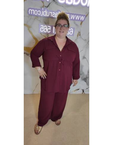 Conjunto de crep, de pantalón de pata ancha y camisa con botonadura en el delantero y cordón para ajustar en la cintura