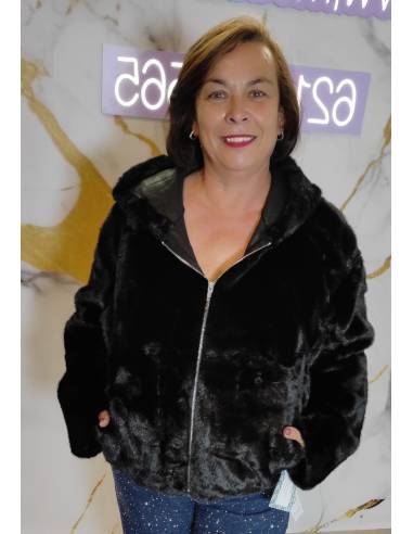 Chaqueta de pelito por fuera, con bolsillos, gorro y con goma en el bajo, el interior es como neopreno