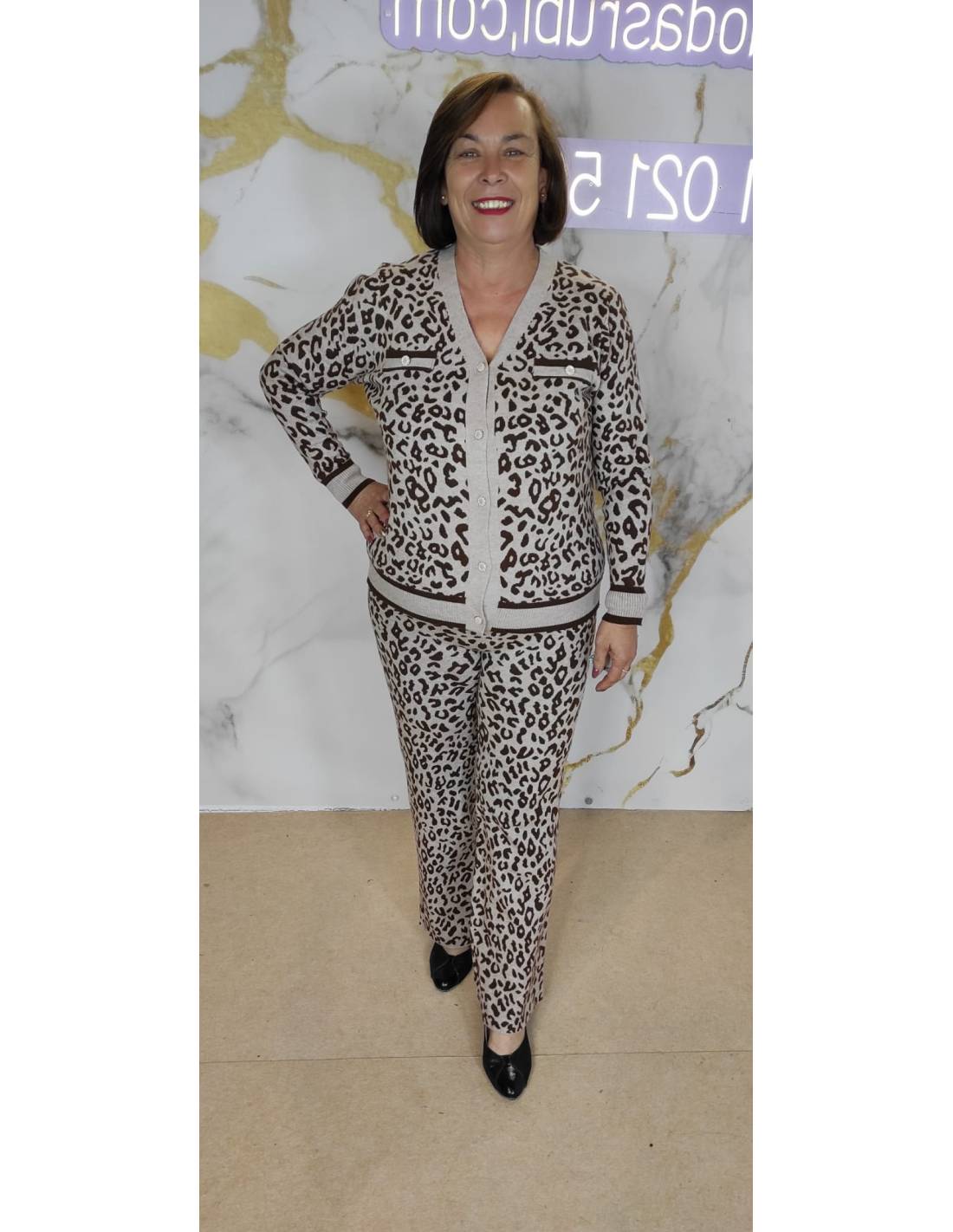 Conjunto de lana de animal print rebeca con botones de perlas pantalón de campana con goma en la cintura