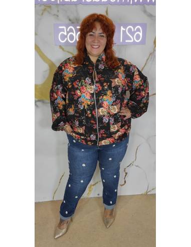 Pantalón pata recta muy elástico con dibujos de margaritas pintados por la parte de delante