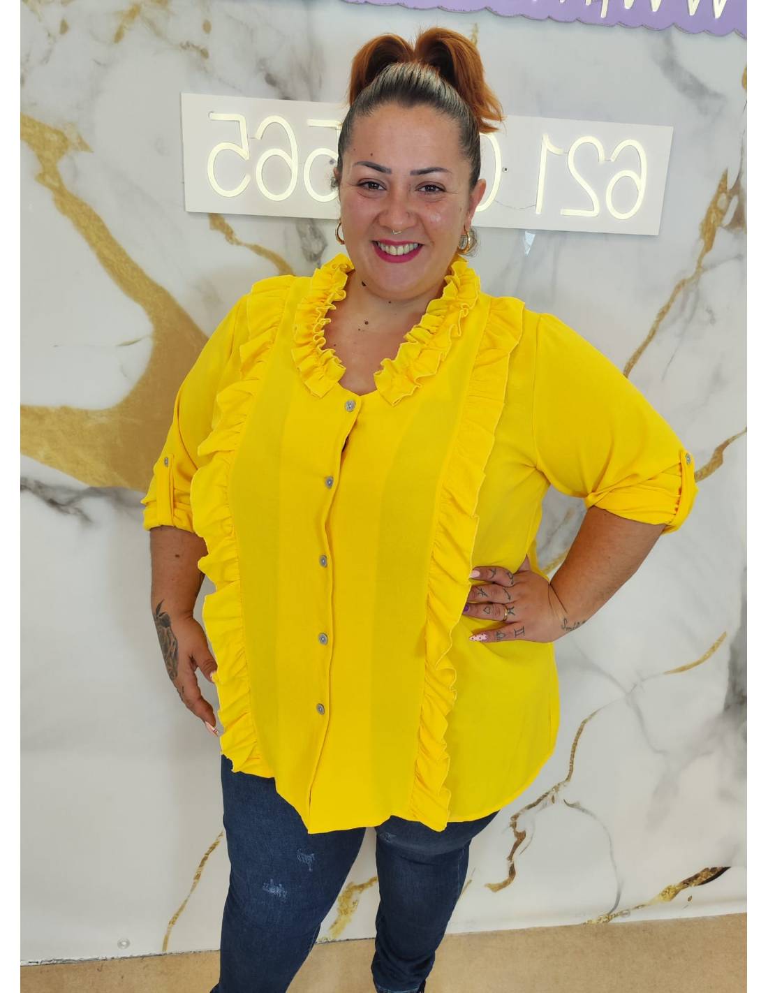 Camisa de crep, cierre con botonadura en el delantero, a los lados de los botones volantito desde el cuello hasta abajo, manga larga que se puede recoger
