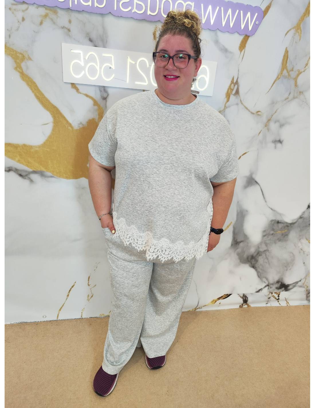 Conjunto de pantalón ancho y camiseta de manga corta con bajo de encaje, asimétrico, tejido de capa de aire